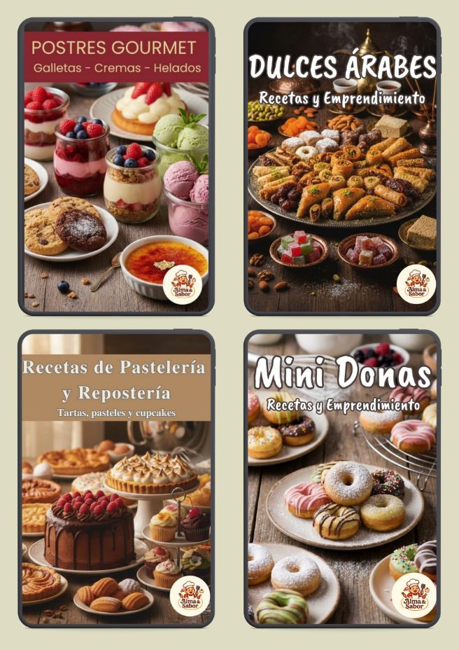 Incluye los Bonus "POSTRES GOURMET II - Galletas - Cremas - Helados", "MINI DONAS - Recetas y Emprendimiento " y "DULCES ÁRABES - Recetas y Emprendimiento".